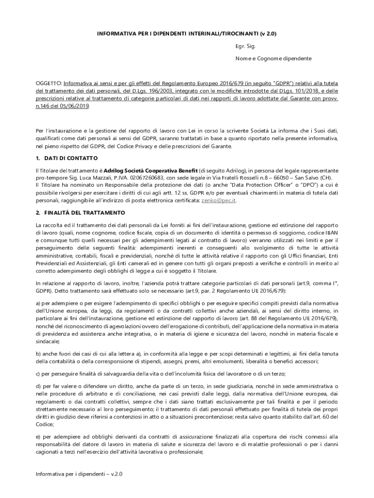 INFORMATIVA PER I DIPENDENTI INTERINALI/TIROCINANTI (v 2.0) Egr. Sig. Nome e Cognome dipendenteOGGETTO: Informativa ai sensi e per gli effetti del Regolamento Europeo 2016/679 (in seguito GDPR) relativi