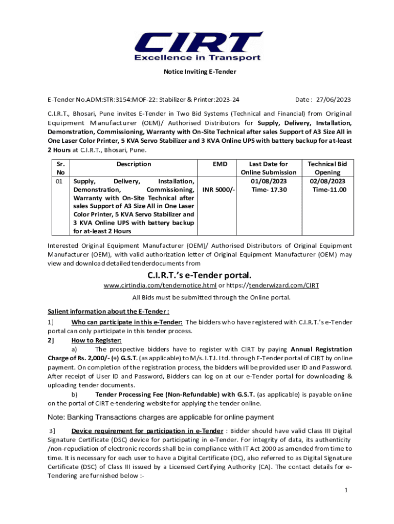Notice Inviting ETenderETender No.ADM:STR:3154:MOF22: Stabilizer & Printer:202324Date : 27/06/2023C.I.R.T., Bhosari, Pune invites ETender in Two Bid Systems (Technical and Financial) from Original