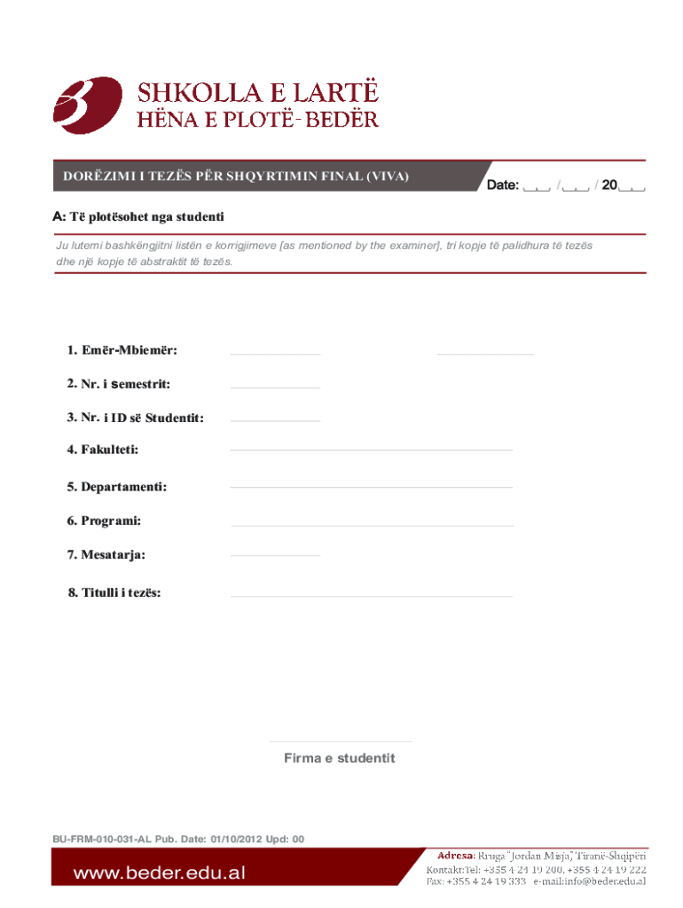 DORZIMI I TEZS PR SHQYRTIMIN FINAL (VIVA) A: T plotsohet nga studenti Ju lutemi bashkngjitni listn e korrigjimeve [as mentioned by the examiner], tri kopje t palidhura t tezs dhe nj kopje t abstraktit