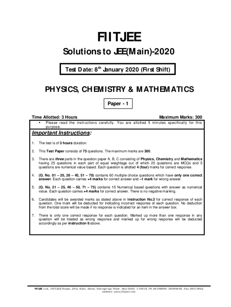 FIITJEE Solutions to JEE(Main)2020 Test Date: 8th January 2020 (First Shift)PHYSICS, CHEMISTRY & MATHEMATICS Paper 1 Time Allotted: 3 Hours Maximum Marks: 300Please read the instructions carefully.