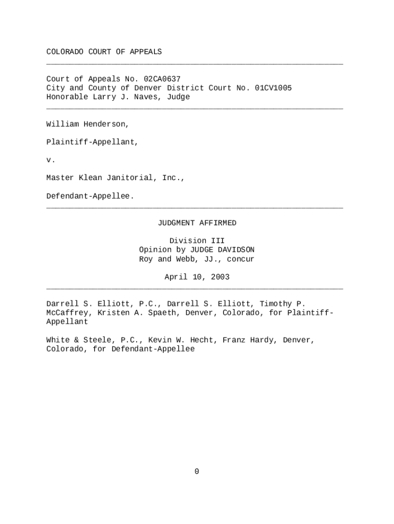 Frequently asked questions about the form Henderson v. Master Klean Janitorial, 70 P.3d 612