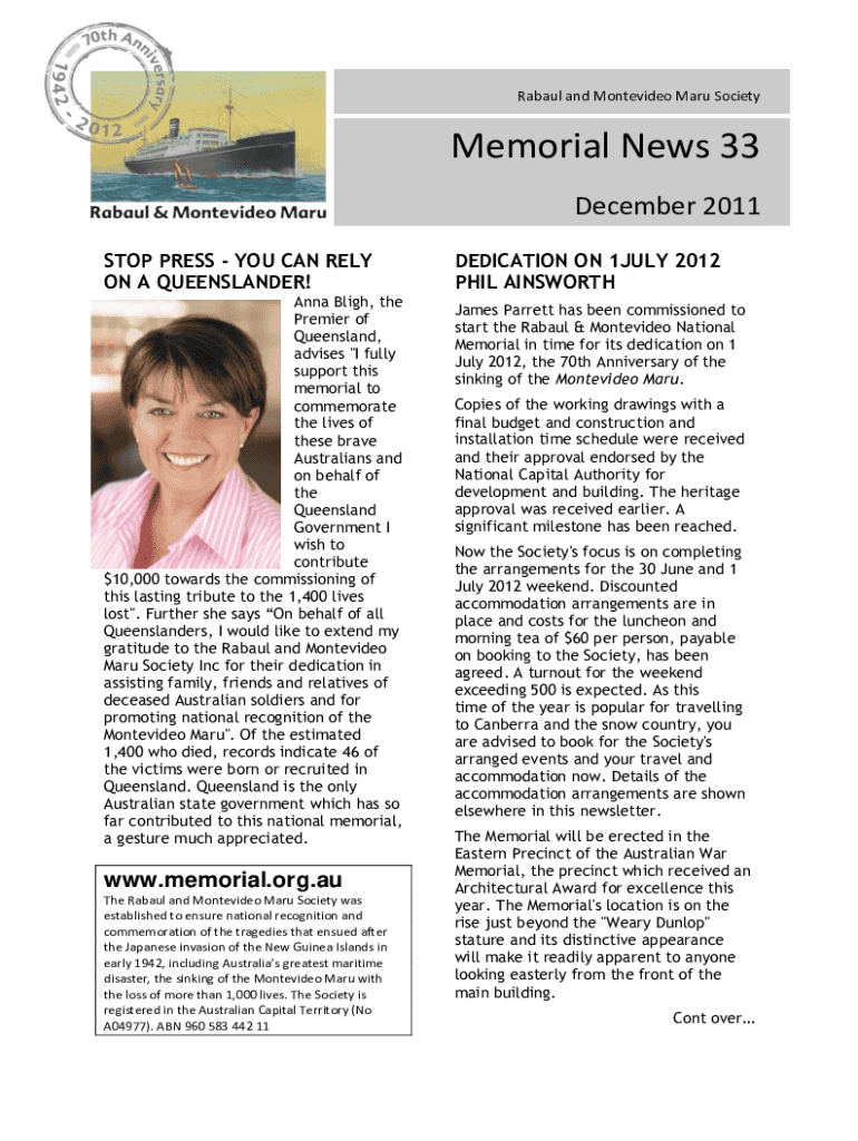 Rabaul and Montevideo Maru SocietyMemorial News 33 December 2011 STOP PRESS YOU CAN RELY ON A QUEENSLANDER! Anna Bligh, the Premier of Queensland, advises \"I fully support this memorial to commemorate