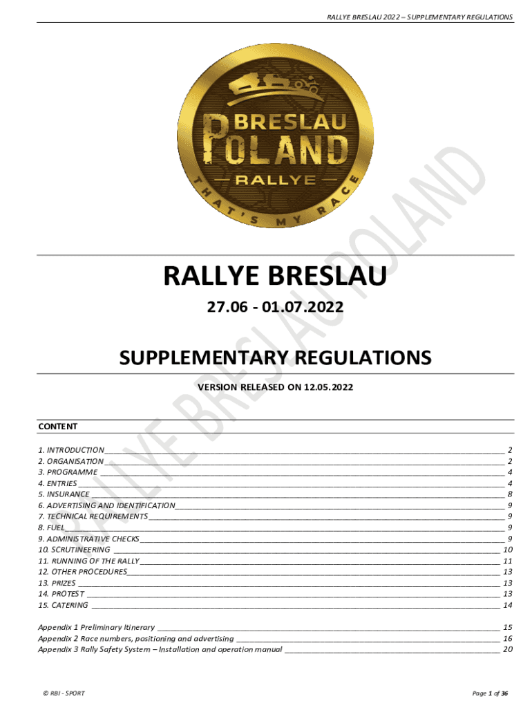 RALLYE BRESLAU 2022 SUPPLEMENTARY REGULATIONSRALLYE BRESLAU 27.06 01.07.2022SUPPLEMENTARY REGULATIONS VERSION RELEASED ON 12.05.2022CONTENT 1. INTRODUCTION ___ 2 2. ORGANISATION ___ 2 3. PROGRAMME