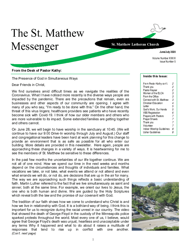 The St. Matthew MessengerSt. Matthew Lutheran Church June/July 2020 Volume Number XXXIX Issue Number 5From the Desk of Pastor Kathy: Inside this Issue:The Presence of God in Simultaneous Ways Dear