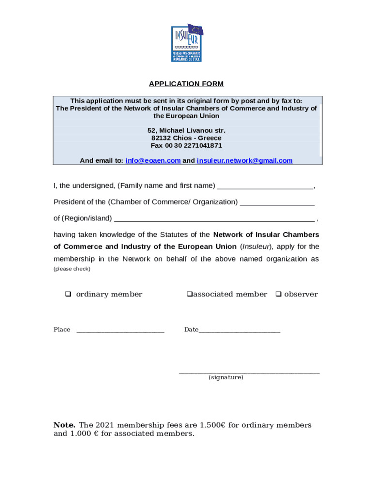 The Network of the Insular Chambers of Commerce and Industry of ... is a document required to be submitted to the specific address in order to provide some info. It must be filled-out and signed, which is possible in hard copy, or by using a particular software like PDFfiller. It lets you fill out any PDF or Word document directly in your browser, customize it according to your requirements and put a legally-binding e-signature. Right after completion, user can send the Network of the Insular Chambers of Commerce and Industry of ... to the relevant receiver, or multiple ones via email or fax. The blank is printable too because of PDFfiller feature and options presented for printing out adjustment. Both in digital and physical appearance, your form should have a organized and professional look. You may also save it as the template to use later, so you don't need to create a new document again. All that needed is to edit the ready form.