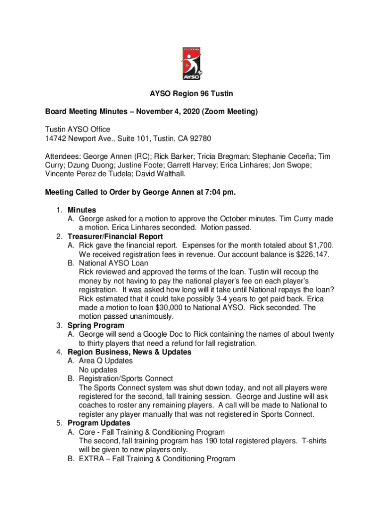AYSO Region 96 Tustin Board Meeting Minutes November 4, 2020 (Zoom Meeting) Tustin AYSO Office 14742 Newport Ave., Suite 101, Tustin, CA 92780 Attendees: George Annen (RC); Rick Barker; Tricia Bregman;