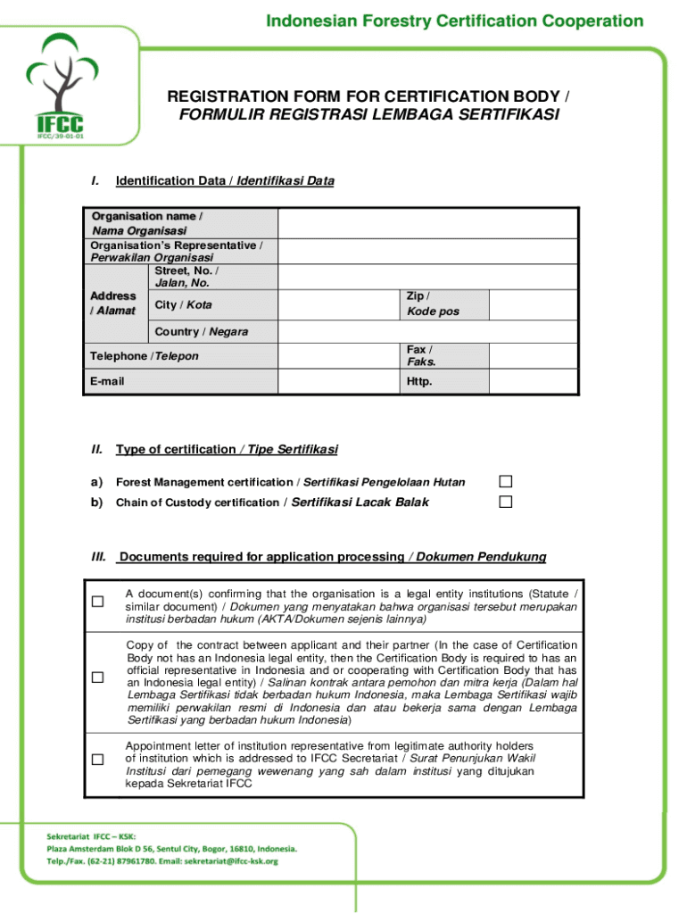 REGISTRATION FORM FOR CERTIFICATION BODY / FORMULIR REGISTRASI LEMBAGA SERTIFIKASII.Identification Data / Identifikasi DataOrganisation name / Nama Organisasi Organisations Representative / Perwakilan