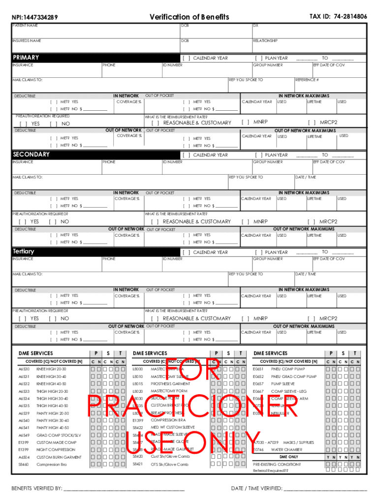 Verification of Benefits NPI:1447334289TAX ID: 742814806PATIENT NAMEDOBDXINSUREDS NAMEDOBRELATIONSHIPPRIMARY[ ] CALENDAR YEARINSURANCEPHONEIN NETWORK