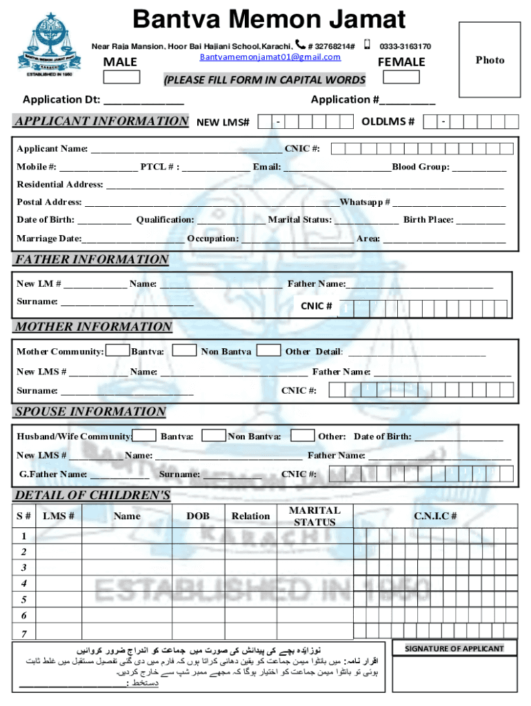 Bantva Memon Jamat (Regd.) MALE FEMALENear Raja Mansion, Hoor Bai Hajiani School,Karachi,# 32768214#03333163170Bantvamemonjamat01@gmail.comPhoto(PLEASE FILL FORM IN CAPITAL WORDS Application Dt: ___Application