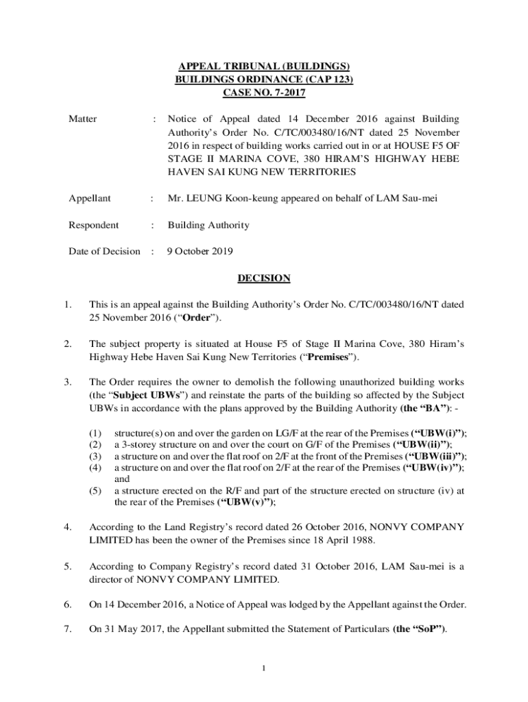 APPEAL TRIBUNAL (BUILDINGS) BUILDINGS ORDINANCE (CAP 123) CASE NO. 72017 Matter:Notice of Appeal dated 14 December 2016 against Building Authoritys Order No. C/TC/003480/16/NT dated 25 November 2016
