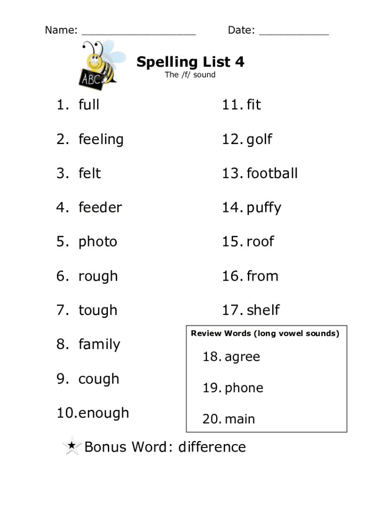 Name: ___Date: ___Spelling List 4 The /f/ sound1. full11. fit2. feeling12. golf3. felt13. football4. feeder14. puffy5. photo15. roof6. rough16. from7. tough17. shelf8. family 9. cough 10.enoughReview