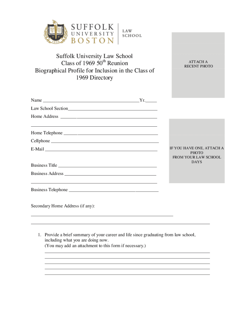 Suffolk University Law School Class of 1969 50th Reunion Biographical Profile for Inclusion in the Class of 1969 DirectoryATTACH A RECENT PHOTOName ___Yr.___ Law School Section___ Home Address ___