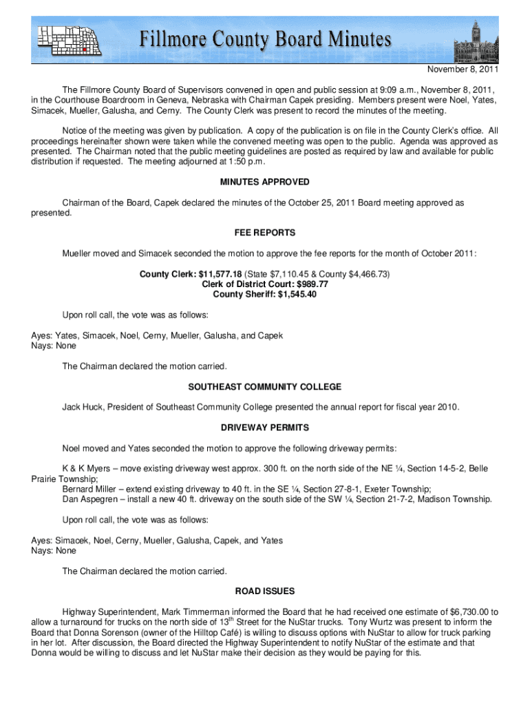 The Fillmore County Board of Supervisors convened in open and public session at 9:09 a.m., November 8, 2011,
