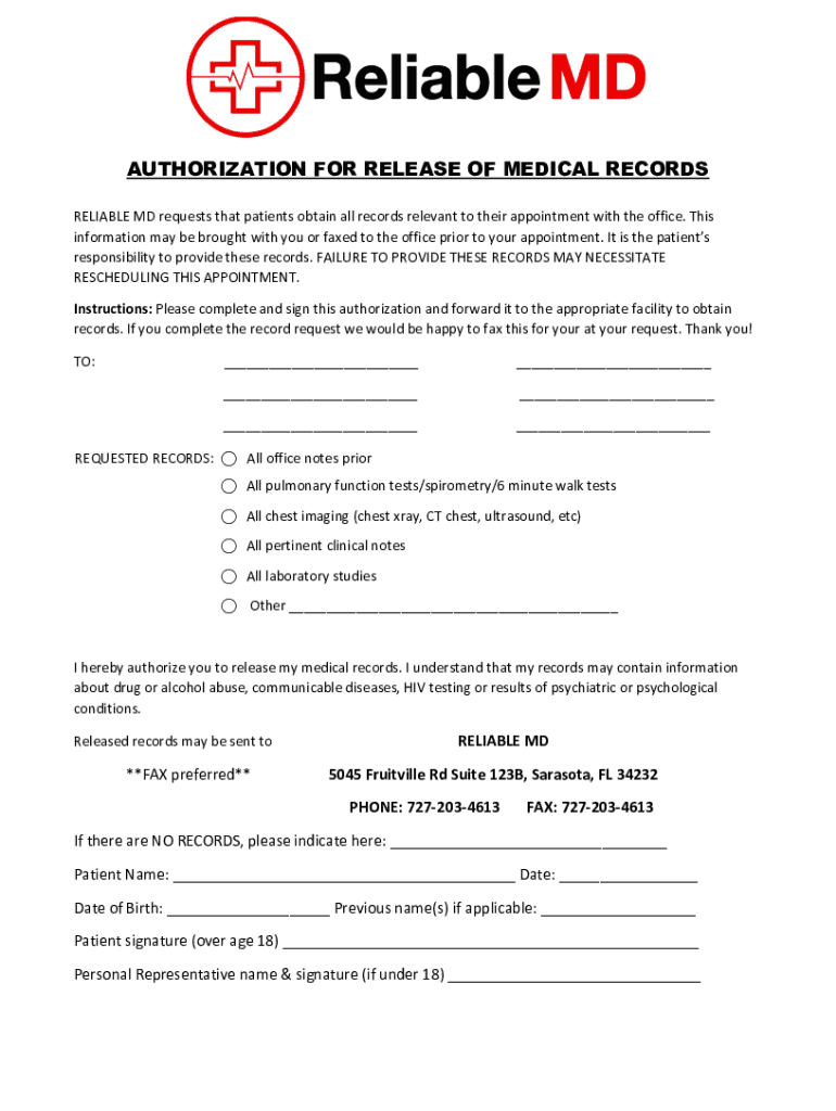 AUTHORIZATION FOR RELEASE OF MEDICAL RECORDS requests that patients obtain all records relevant to their appointment with the office. This information may be brought with you or faxed to the office