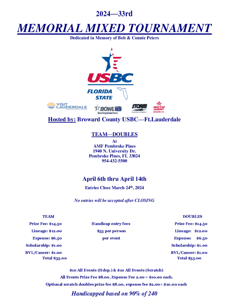 202433rdMEMORIAL MIXED TOURNAMENT Dedicated in Memory of Bob & Connie PetersHosted by: Broward County USBCFt.Lauderdale TEAMDOUBLES At AMF Pembroke Pines 1940 N. University Dr. Pembroke Pines, FL