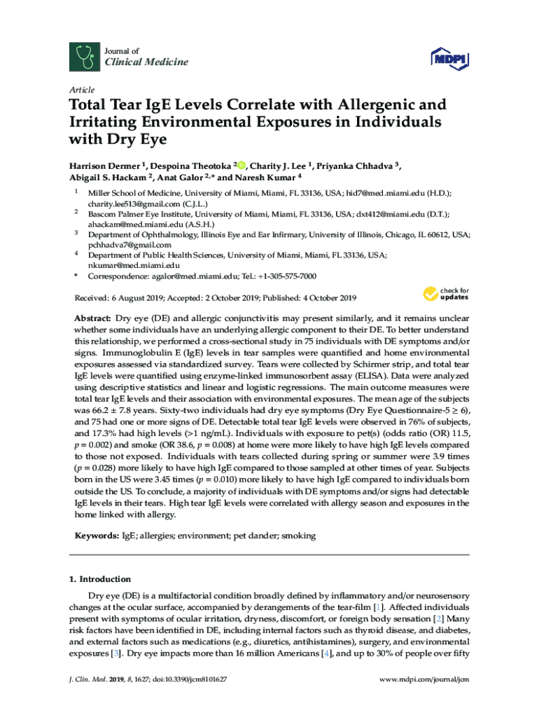 Journal ofClinical Medicine ArticleTotal Tear IgE Levels Correlate with Allergenic and Irritating Environmental Exposures in Individuals with Dry Eye Harrison Dermer 1 , Despoina Theotoka 2 , Charity