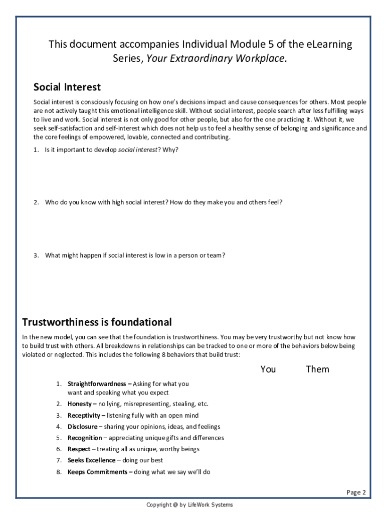 This document accompanies Individual Module 5 of the eLearning Series, Your Extraordinary Workplace. Social Interest Social interest is consciously focusing on how ones decisions impact and cause