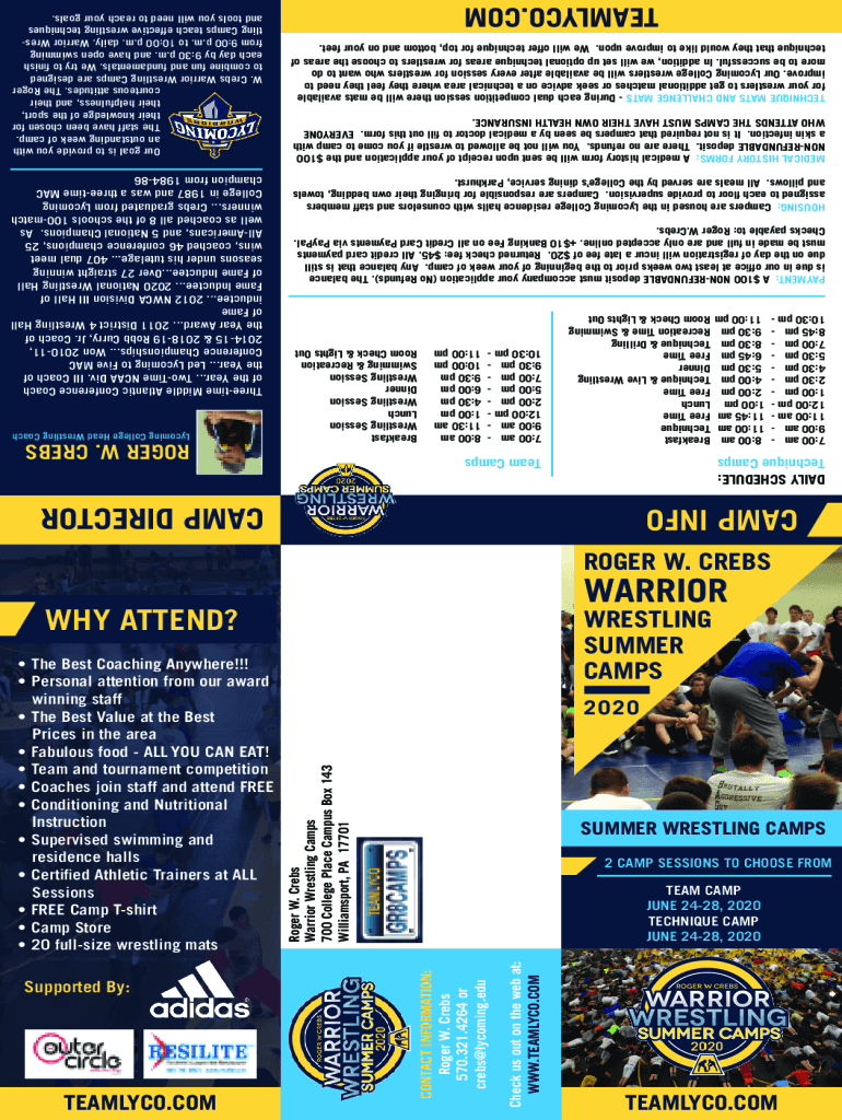 Check us out on the web at: WWW.TEAMLYCO.COMCONTACT INFORMATION: Roger W. Crebs 570.321.4264 or crebs@lycoming.eduTEAMLYCO.COM Supported By:TEAMLYCO.COM TEAM CAMP JUNE 2428, 2020 TECHNIQUE CAMP JUNE