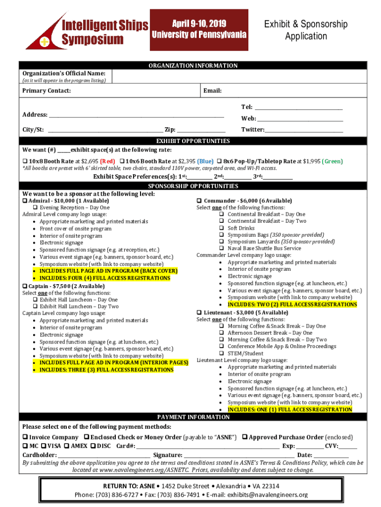 Exhibit & Sponsorship ApplicationOrganizations Official Name:ORGANIZATION INFORMATION(as it will appear in the program listing)Primary Contact:Email:Address: ___City/St: ___ Zip: ___Tel: ___Web: ___Twitter:___EXHIBIT