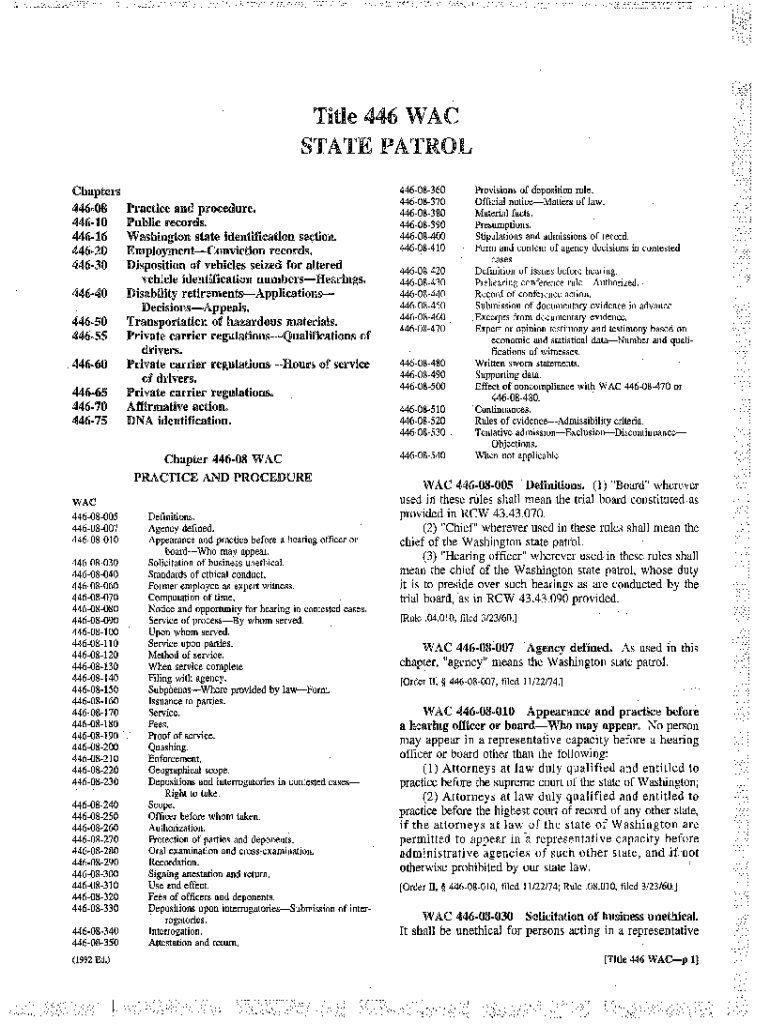 Title 446 WAC STATE PATROL Chapters 44608 44610 44616 44620 44630 44640 44650 44655 . 44660 44665 44670 44675Practice and procedure. Public records. Washington state identification section. EmploymentConviction