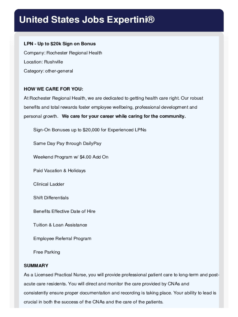 United States Jobs Expertini LPN Up to $20k Sign on Bonus Company: Rochester Regional Health Location: Rushville Category: othergeneralHOW WE CARE FOR YOU: At Rochester Regional Health, we are dedicated