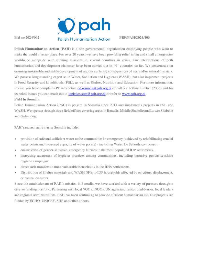 Bid no 2024/002PRF/PAH/2024/403Polish Humanitarian Action (PAH) is a nongovernmental organization employing people who want to