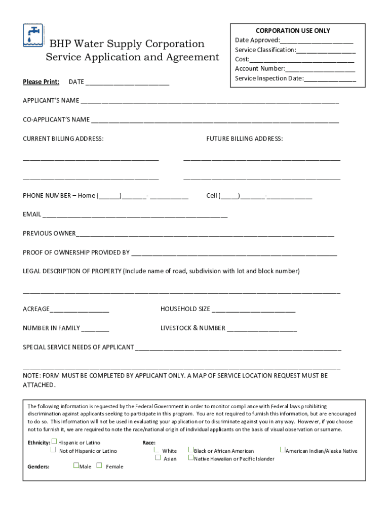 BHP Water Supply Corporation Service Application and Agreement Please Print:DATE ___CORPORATION USE ONLY Date Approved:___ Service Classification:___ Cost:___ Account Number:___ Service Inspection