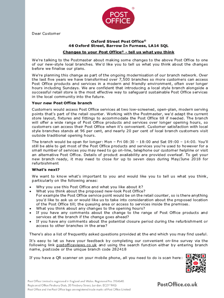 Dear Customer Oxford Street Post Office 46 Oxford Street, Barrow In Furness, LA14 5QL Changes to your Post Office tell us what you think Were talking to the Postmaster about making some changes to
