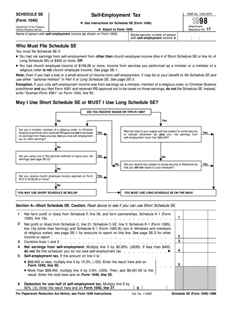 Practitioner and you filed Form 4361 and received IRS approval not to be ... Schedule SE (Form 1040) 1998 ... DID YOU RECEIVE WAGES OR TIPS IN 1998 ? .... You had net earnings from self-employment