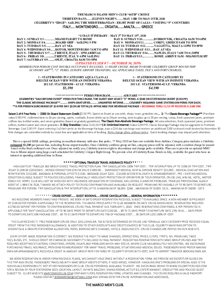 THE MARCO ISLAND MENS CLUB 46TH CRUISE THIRTEEN DAYSELEVEN NIGHTS MAY 3 RD TO MAY 15TH, 2020 CELEBRITYS EDGE SAILING THE MEDITERRANEAN EIGHT PORT OF CALLS VISITING 5 COUNTRIESITALY..MONTENEGRO....CROATIA....MALTA....GREECE