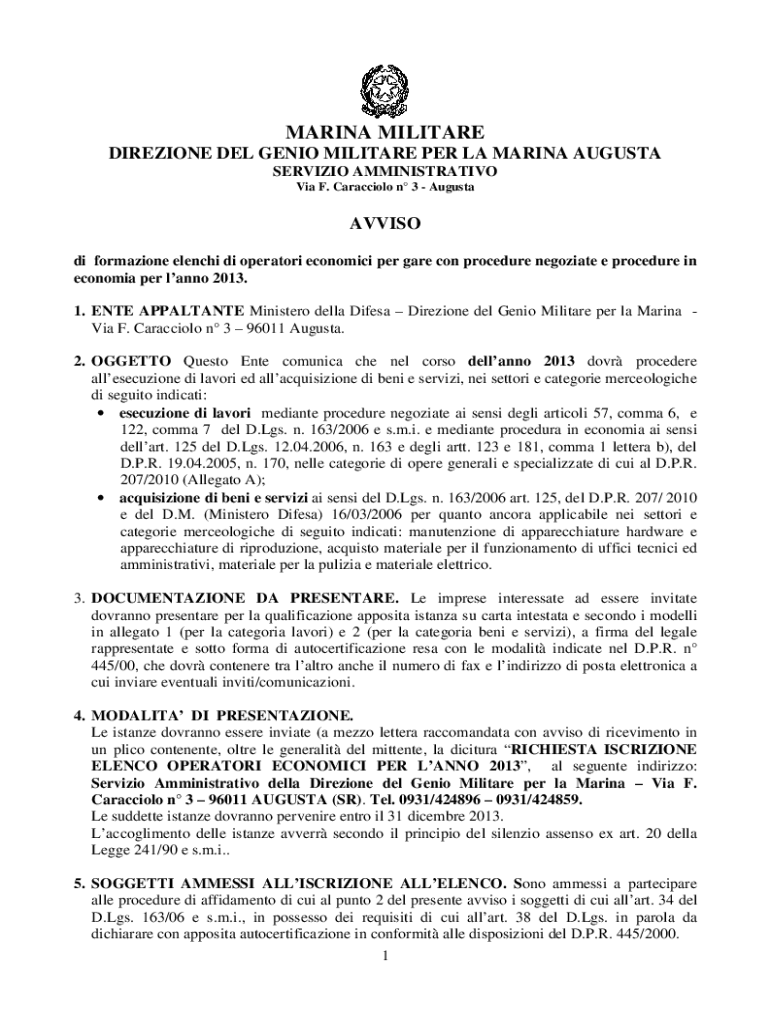 MARINA MILITARE DIREZIONE DEL GENIO MILITARE PER LA MARINA AUGUSTA SERVIZIO AMMINISTRATIVO Via F. Caracciolo n 3 AugustaAVVISO di formazione elenchi di operatori economici per gare con procedure negoziate