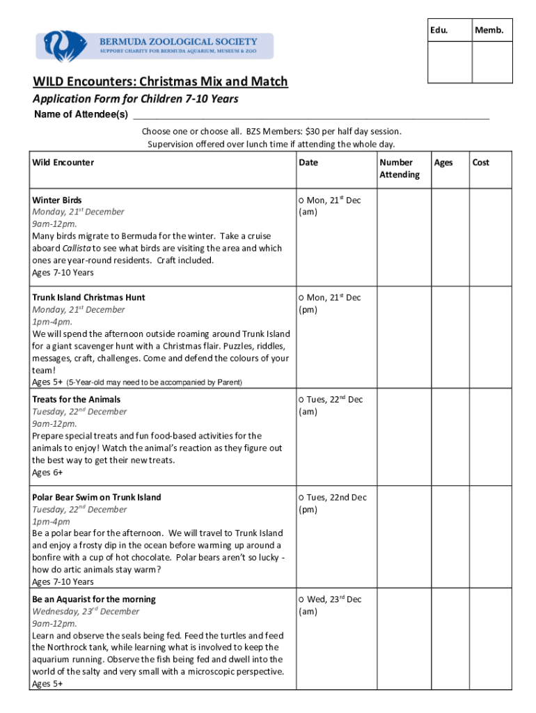Edu.Memb.WILD Encounters: Christmas Mix and Match Application Form for Children 710 Years Name of Attendee(s) ___ Choose one or choose all. BZS Members: $30 per half day session. Supervision offered
