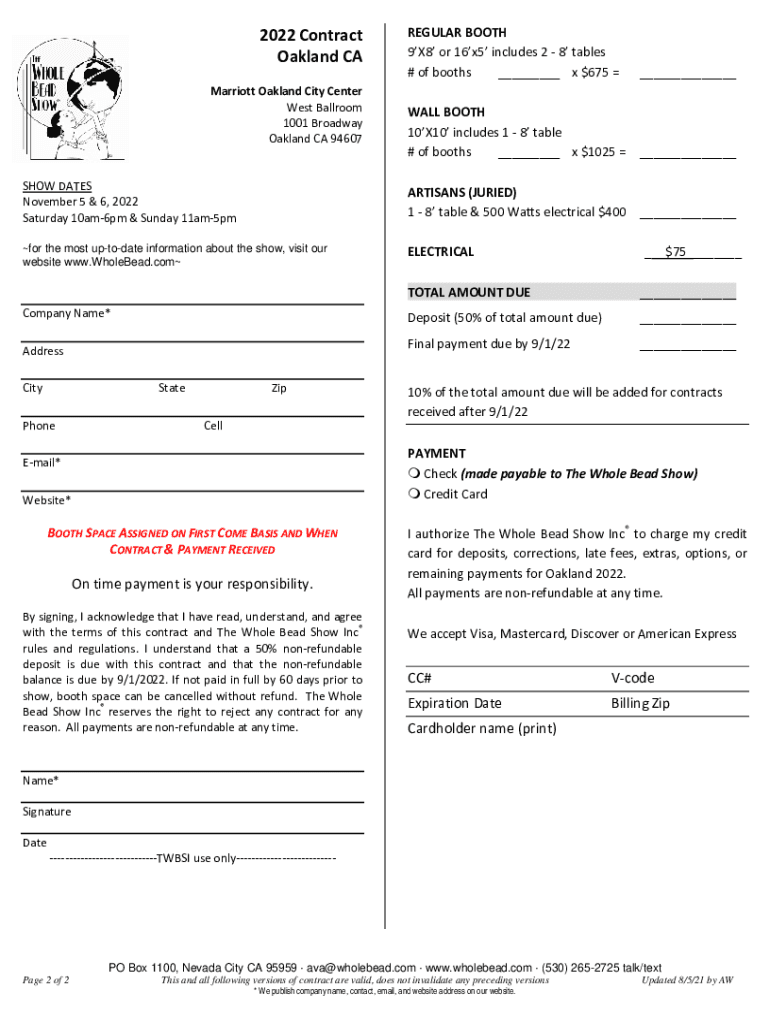 REGULARBOOTH 9X8or16x5includes28tables #ofbooths ___ x$675 WALLBOOTH 10X10includes18table #ofbooths ___ x$1025 ARTISANS(JURIED) 18table&500Wattselectrical$400 ELECTRICAL TOTALAMOUNTDUE CompanyName*Deposit(50%oftotalamountdue)___Finalpaymentdueby9/1/22___2022Contract
