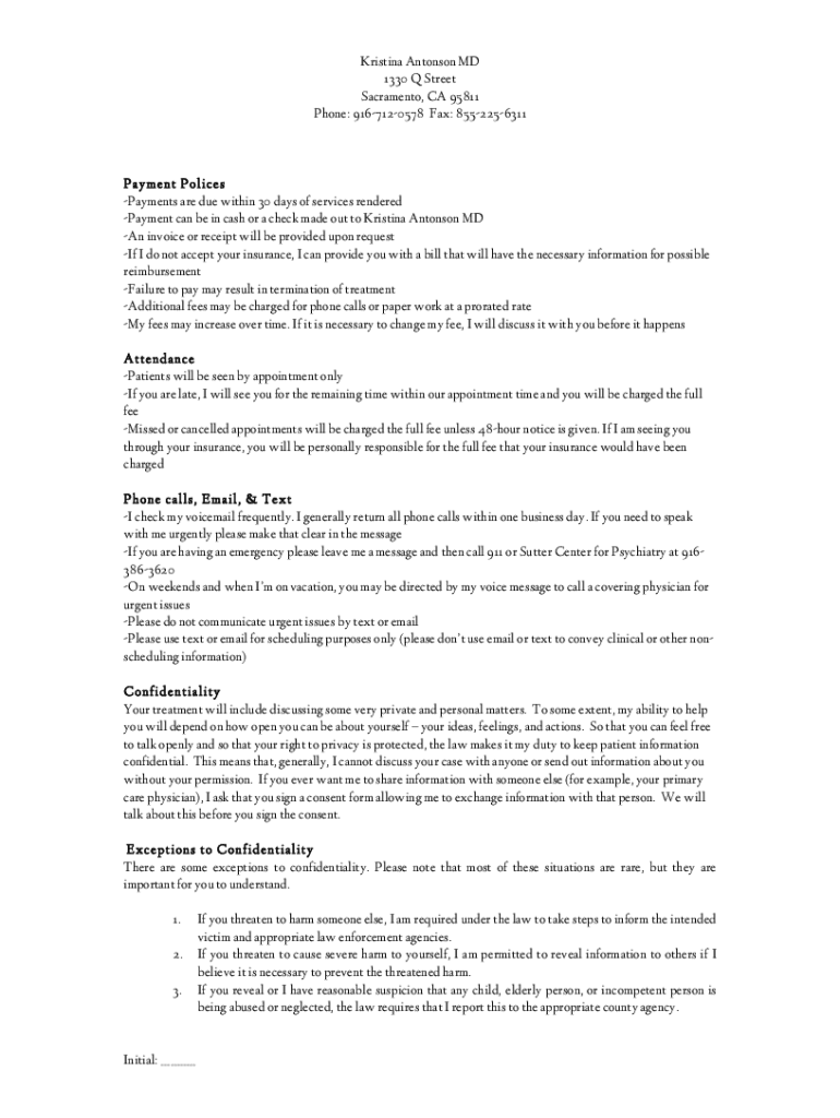 Kristina Antonson MD 1330 Q Street Sacramento, CA 95811 Phone: 9167120578 Fax: 8552256311Payment Polices Payments are due within 30 days of services rendered Payment can be in cash or a check made