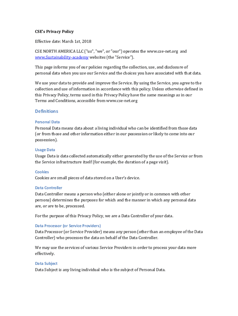 CSEs Privacy Policy Effective date: March 1st, 2018 CSE NORTH AMERICA LLC (\"us\", \"we\", or \"our\") operates the www.csenet.org and www.Sustainabilityacademy websites (the \"Service\"). This page