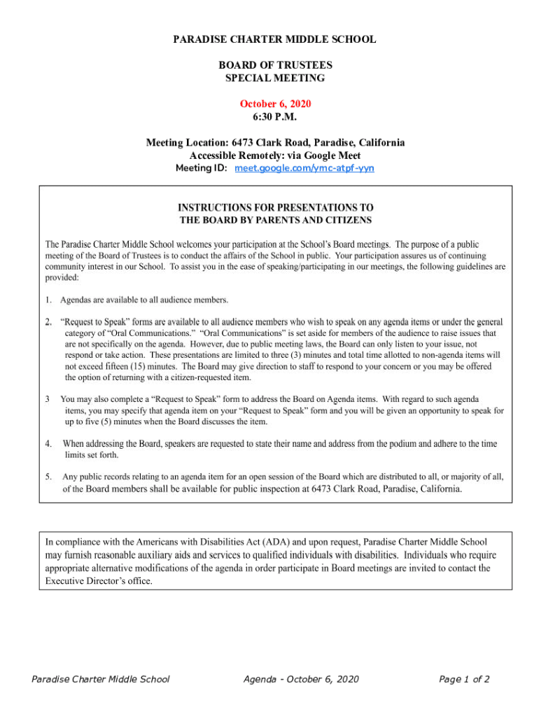 PARADISE CHARTER MIDDLE SCHOOL BOARD OF TRUSTEES SPECIAL MEETING October 6, 2020 6:30 P.M. Meeting Location: 6473 Clark Road, Paradise, California Accessible Remotely: via Google Meet Meeting ID: