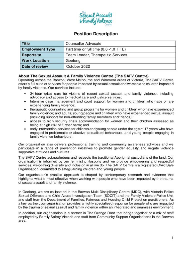 Position Description TitleCounsellor AdvocateEmployment TypePart time or full time (0.6 1.0 FTE)Reports toTeam Leader, Therapeutic ServicesWork LocationGeelongDate of reviewOctober 2022About The Sexual