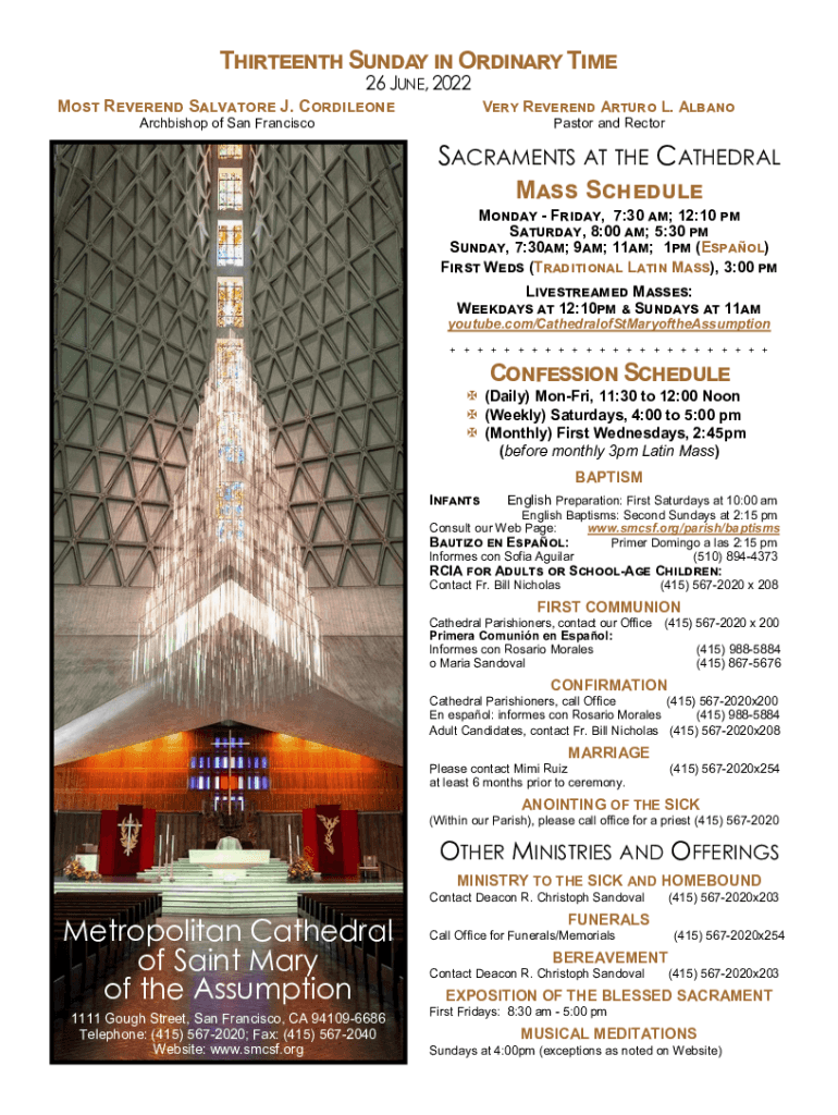 Thirteenth Sunday in Ordinary Time 26 JUNE, 2022..Most Reverend Salvatore J. CordileoneVery Reverend Arturo L. AlbanoArchbishop of San FranciscoPastor and RectorSACRAMENTS AT THE CATHEDRAL Mass Schedule