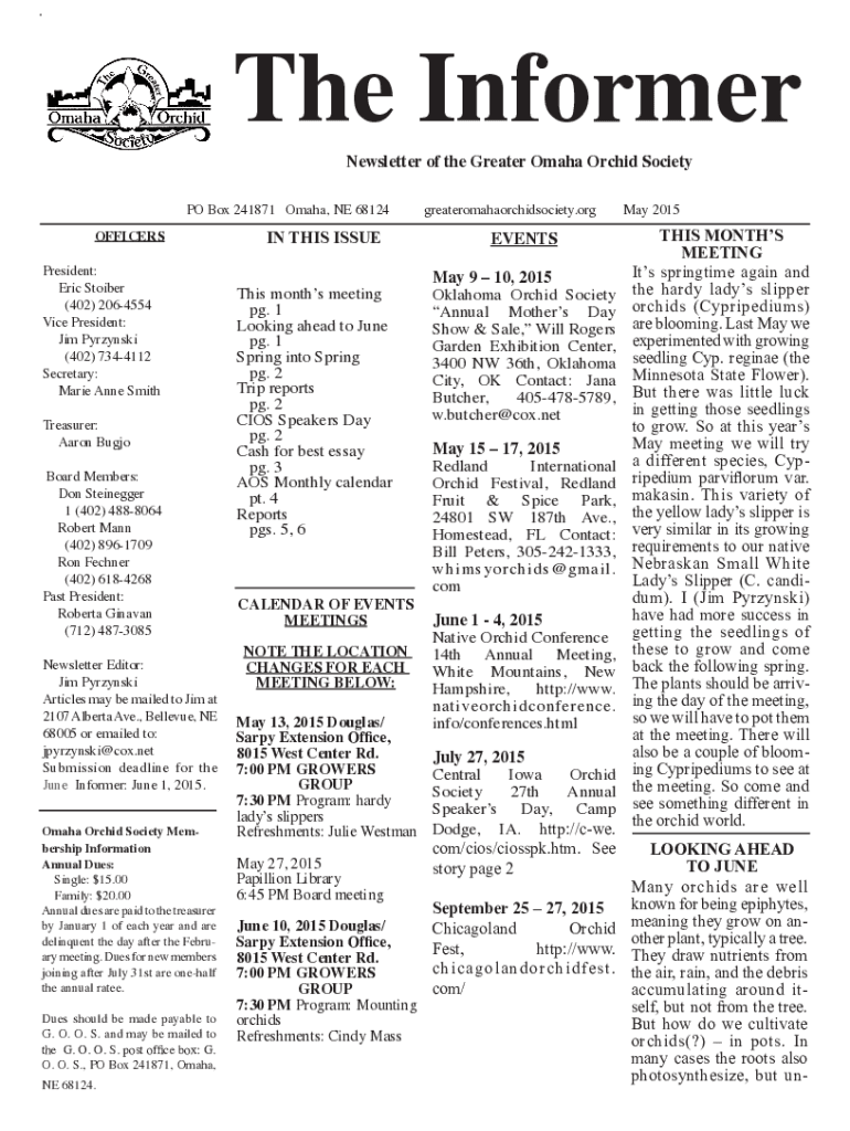 The Informer Newsletter of the Greater Omaha Orchid SocietyPO Box 241871 Omaha, NE 68124 OFFICERS President:Eric Stoiber(402) 2064554 Vice President:Jim Pyrzynski(402) 7344112 Secretary:Marie Anne
