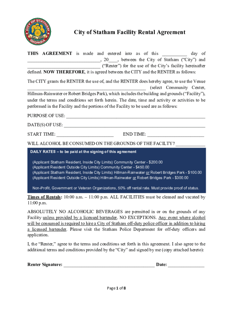 City of Statham Facility Rental Agreement THIS AGREEMENT is made and entered into as of this ___ day of ___, 20___, between the City of Statham (City) and ___ (Renter) for the use of the Citys facility
