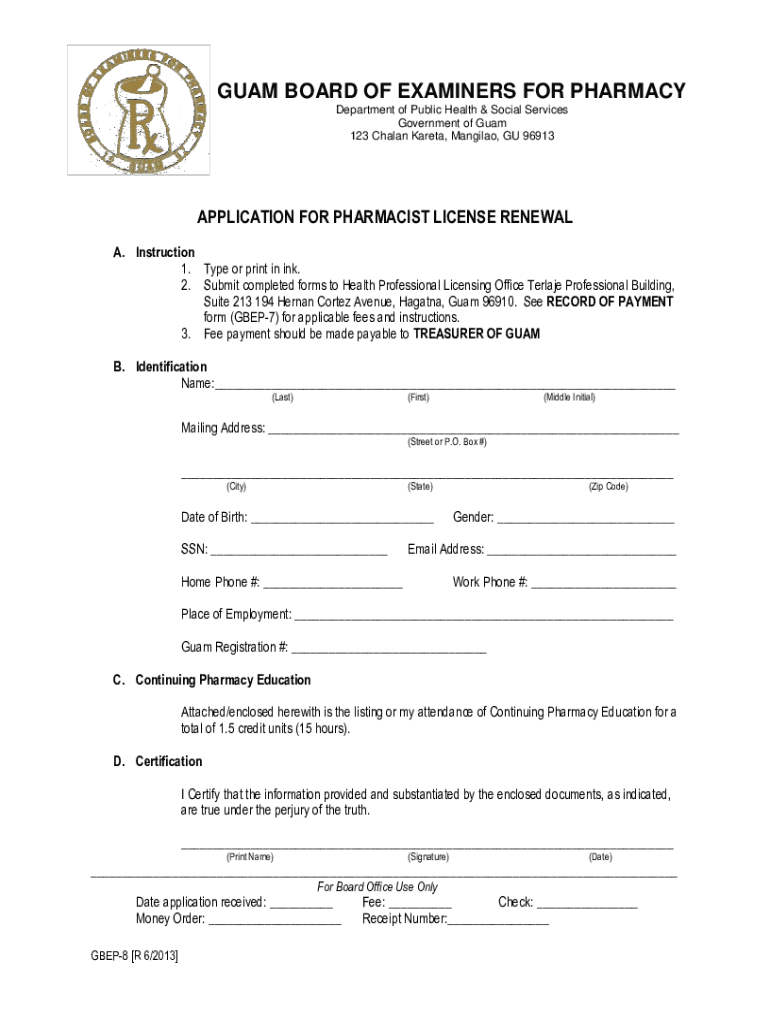 GUAM BOARD OF EXAMINERS FOR PHARMACY Department of Public Health & Social Services Government of Guam 123 Chalan Kareta, Mangilao, GU 96913APPLICATION FOR PHARMACIST LICENSE RENEWAL A. Instruction