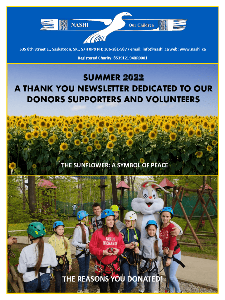 535 8th Street E., Saskatoon, SK., S7H 0P9 PH: 3062819877 email: info@nashi.ca web: www.nashi.ca Registered Charity: 853912194RR0001SUMMER 2022 A THANK YOU NEWSLETTER DEDICATED TO OUR DONORS SUPPORTERS