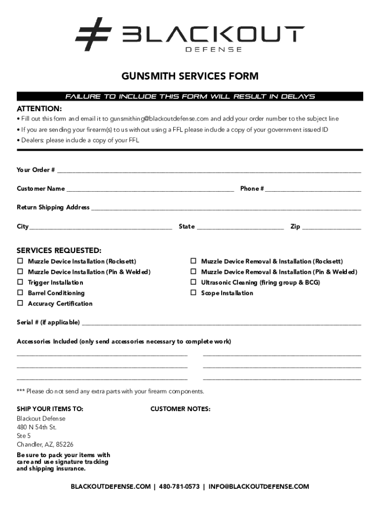 GUNSMITH SERVICES FORM Failure to include this form will result in delaysATTENTION: Fill out this form and email it to gunsmithing@blackoutdefense.com and add your order number to the subject line