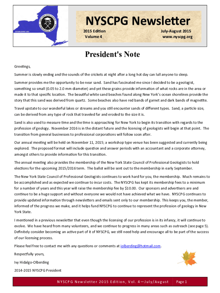 NYSCPG Newsletter 2015 Edition Volume 4JulyAugust 2015 www.nyscpg.orgPresident\'s Note Greetings, Summer is slowly ending and the sounds of the crickets at night after a long hot day can lull anyone