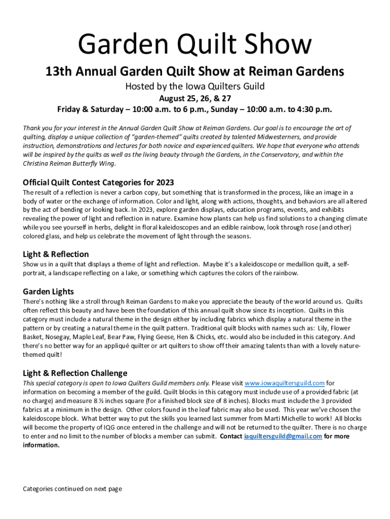 Garden Quilt Show13th Annual Garden Quilt Show at Reiman Gardens Hosted by the Iowa Quilters GuildAugust 25, 26, & 27 Friday & Saturday 10:00 a.m. to 6 p.m., Sunday 10:00 a.m. to 4:30 p.m. Thank you