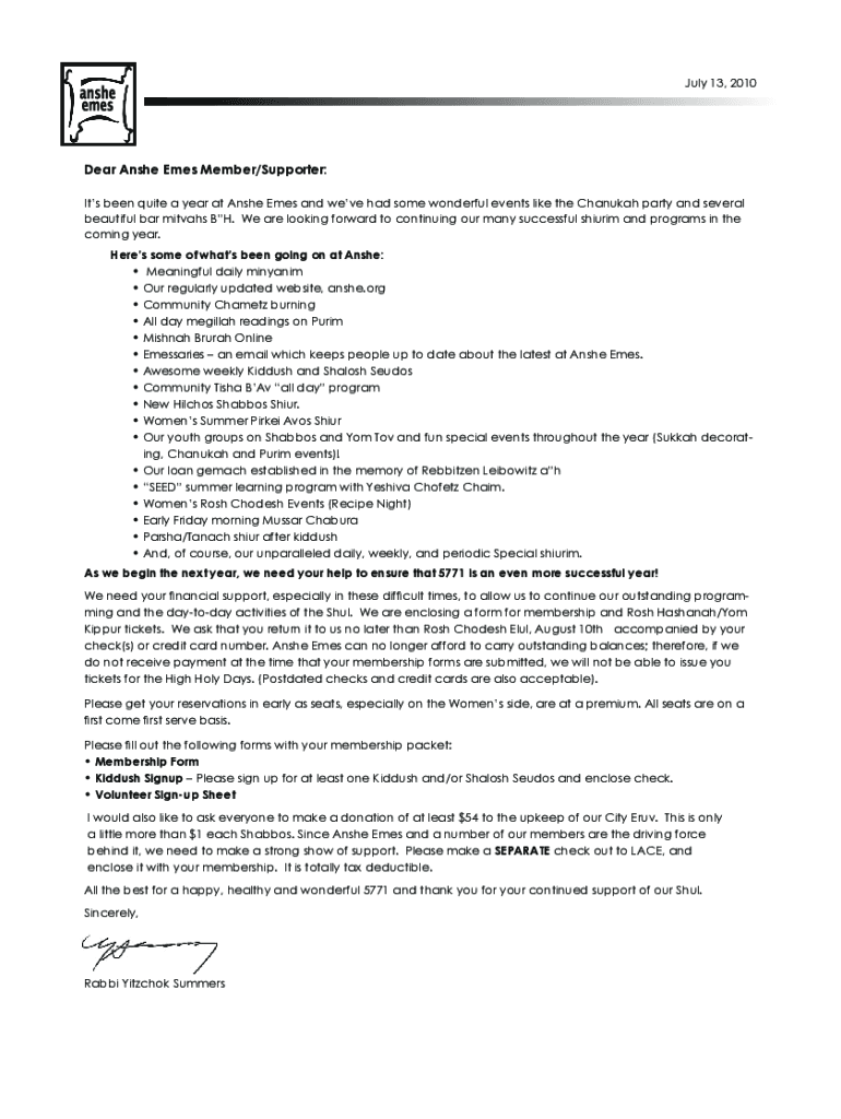 July 13, 2010Dear Anshe Emes Member/Supporter: Its been quite a year at Anshe Emes and weve had some wonderful events like the Chanukah party and several beautiful bar mitvahs BH. We are looking forward