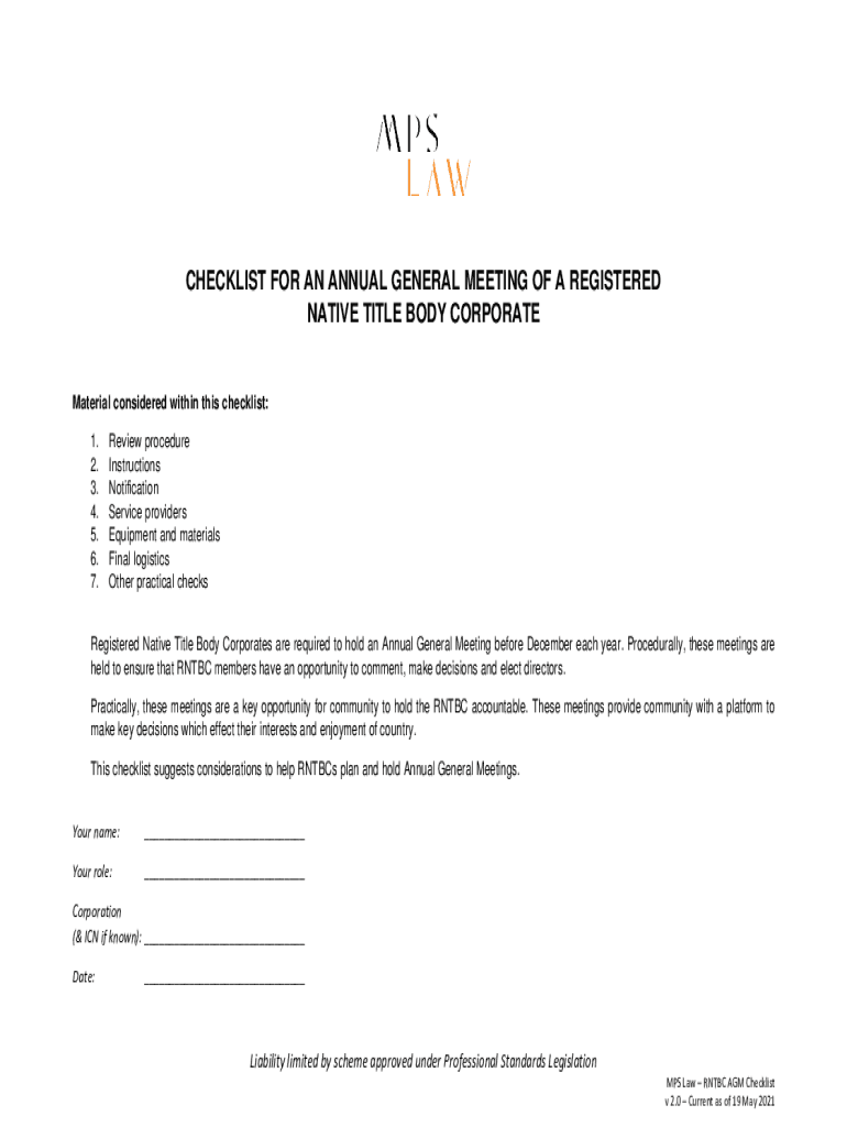 CHECKLIST FOR AN ANNUAL GENERAL MEETING OF A REGISTERED NATIVE TITLE BODY CORPORATEMaterial considered within this checklist: 1. 2. 3. 4. 5. 6. 7.Review procedure Instructions Notification Service