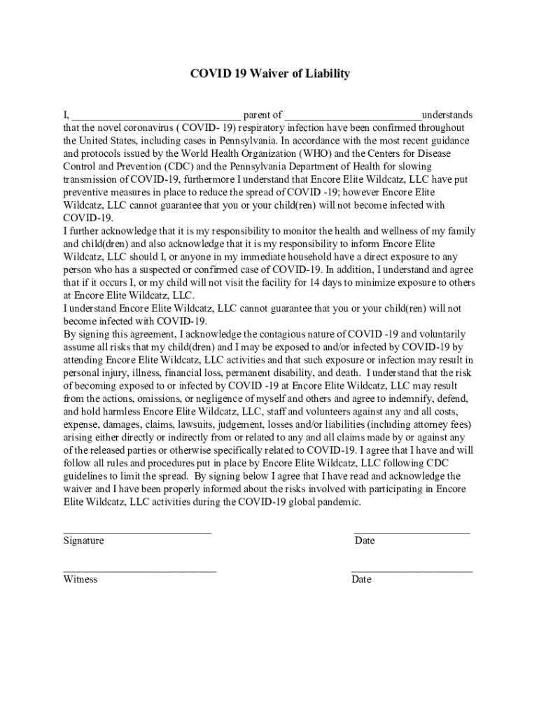 COVID 19 Waiver of Liability I, ___ parent of ___understands that the novel coronavirus ( COVID 19) respiratory infection have been confirmed throughout the United States, including cases in Pennsylvania.