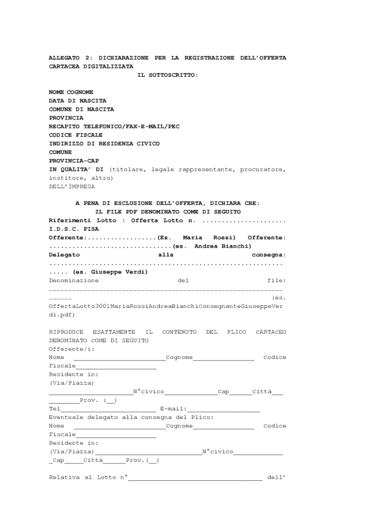 ALLEGATO 2: DICHIARAZIONE PER LA REGISTRAZIONE DELLOFFERTA CARTACEA DIGITALIZZATA IL SOTTOSCRITTO: NOME COGNOME DATA DI NASCITA COMUNE DI NASCITA PROVINCIA RECAPITO TELEFONICO/FAXEMAIL/PEC CODICE