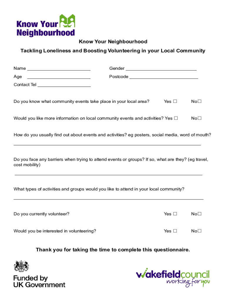 Know Your Neighbourhood Tackling Loneliness and Boosting Volunteering in your Local CommunityName ___Gender ___AgePostcode ______Contact Tel ___Do you know what community events take place in your
